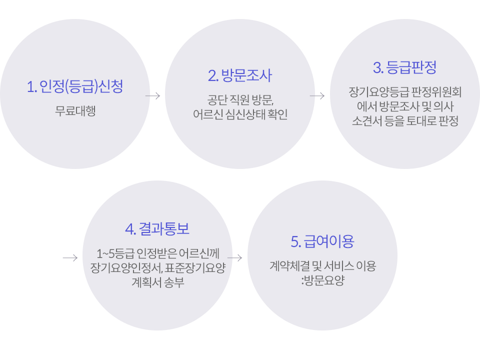 장기요양인정절차는 먼저 공단에 장기요양인정신청으로부터 출발하여 공단직원의 방문에 의한 인정조사와 등급판정위원회의 등급판정 그리고 장기요양인정서와 표준장기요양이용계획서의 작성 및 송부로 이루어집니다.