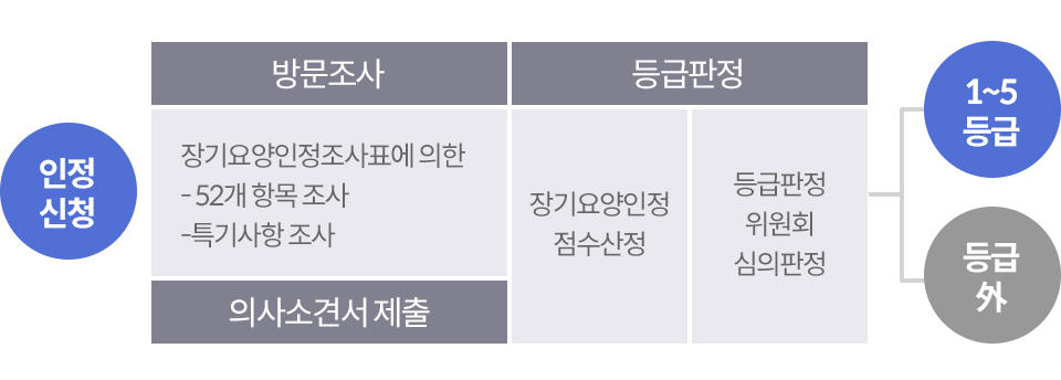 ※ 장기요양인정 신청자격 : 장기요양보험 가입자 및 그 피부양자 또는 의료급여수급권자 중 65세 이상의 노인 또는 65세 미만자로서 치매, 뇌혈관성 질환 등 노인성 질병을 가진 자