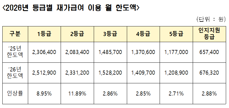 * 월 이용 한도액 (공담 부담 85% + 본인 부담 15%)은 장기 요양등급별로 지급하는 금액이며, 한도액 초과 시 100% 본인 부담입니다.